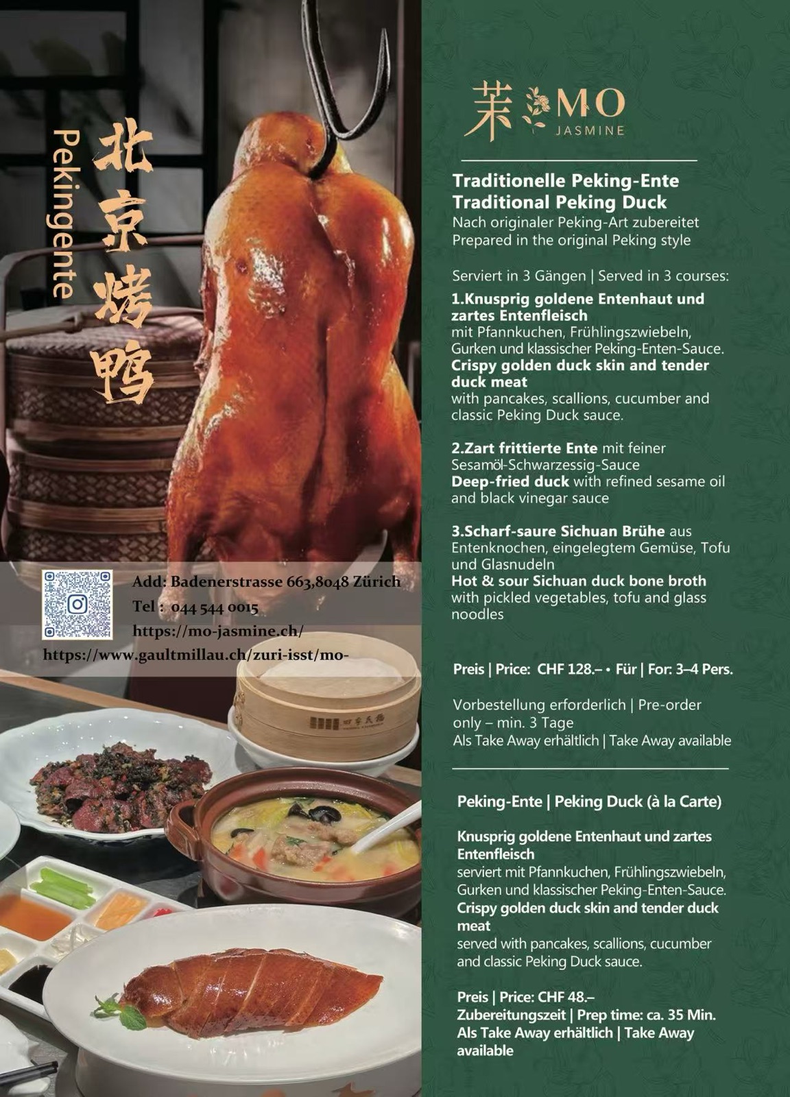 Pagoda Pork Belly (CHF 50.–) and Peking Duck 3-course menu (CHF 128.–) require pre-ordering 2 days in advance.